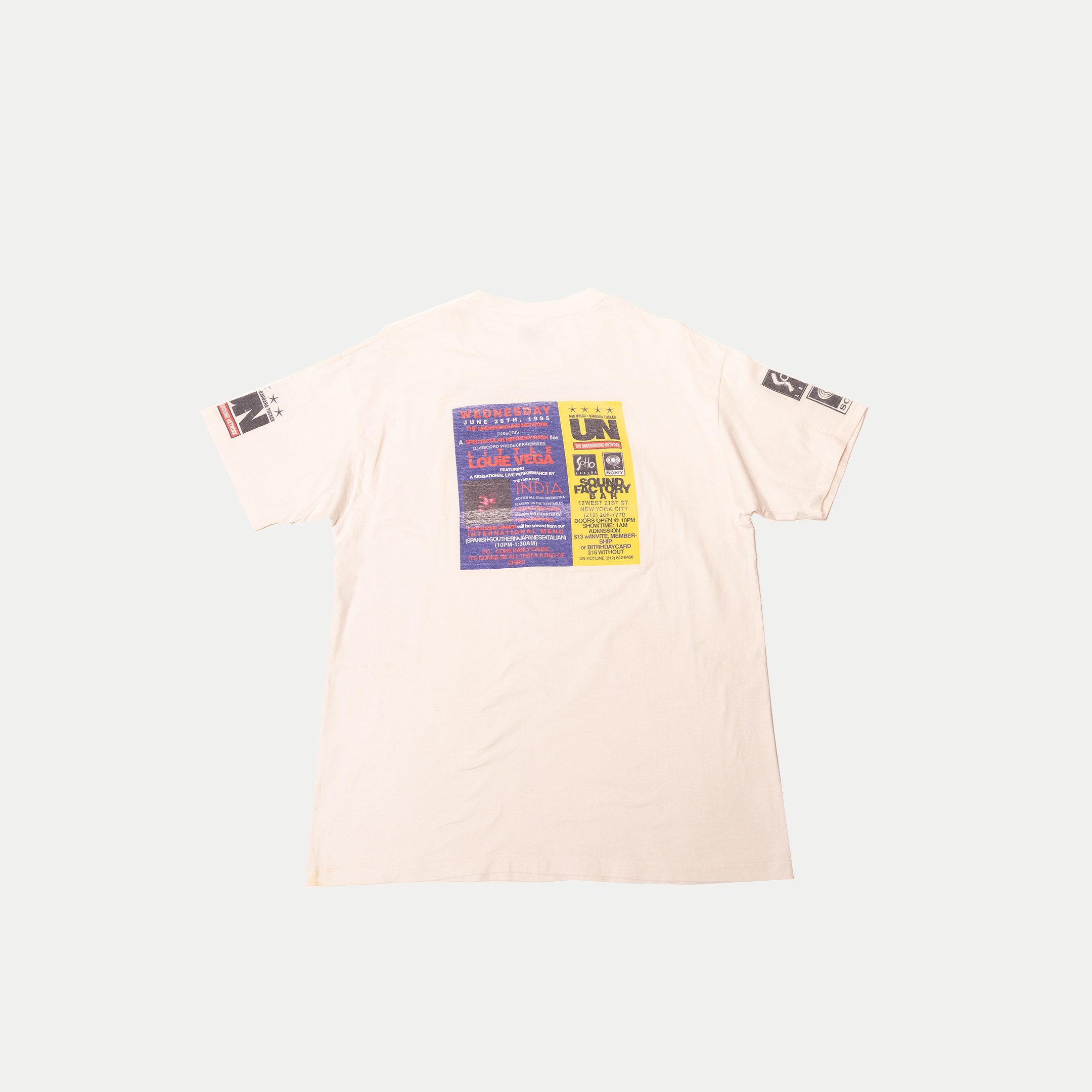 This shirt comes from a standout Underground Network event on June 28, 1995 — where Louie Vega played alongside India and Tony Humphries. The night was electric, especially in the smaller Funk Hut where dancers packed the floor.